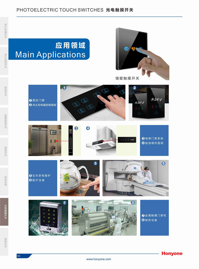 光電式金屬觸摸開關(guān)的應(yīng)用領(lǐng)域也很廣泛:酒店,高端住宅內(nèi)的墻壁開關(guān),酒店門禁系統(tǒng),廚房抽油煙機(jī),食品加工機(jī)械,醫(yī)療設(shè)備等領(lǐng)域。相信在不久的將來,HONYONE的光電觸摸開關(guān),會在更多的日常生活中得到推廣應(yīng)用。