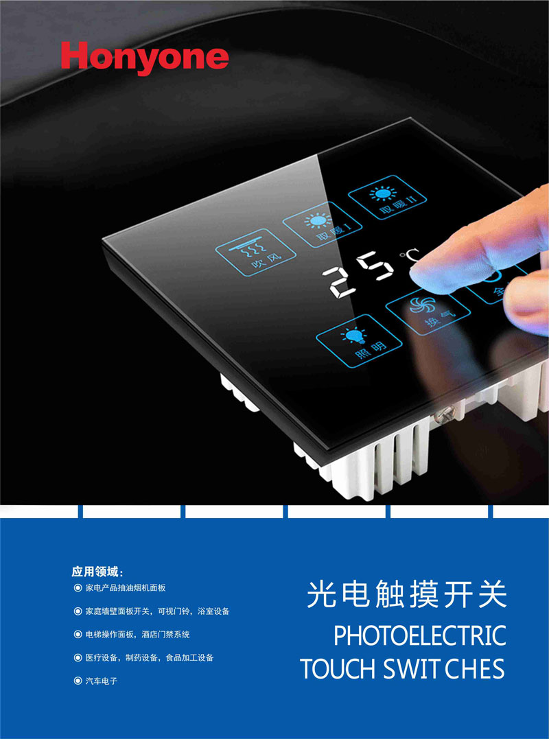 第四階段(2016-2018)光電觸摸開關的研發階段,HONYONE公司綜合多年來的觸摸開關研發工作,將光電觸摸技術應用于開關行業,形成了最新的光電觸摸式開關,利用光學與電子轉換的工作原理,解決了之前電阻式,電容式,壓電式觸摸開關的局限性,能更好的解決實際應用中的各種問題。