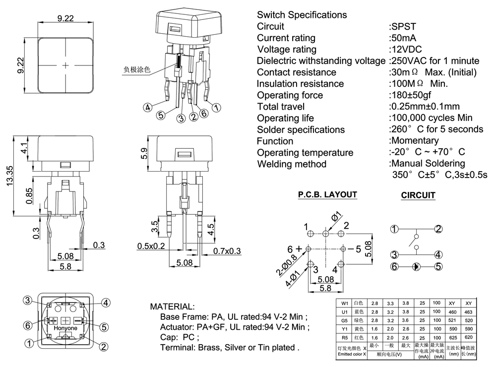 Operating Force                      :180±50gf or 250±50gf