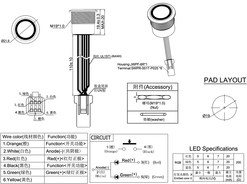 產品型號:PTM19-11M-F-RRG-S0 6PIN插頭
