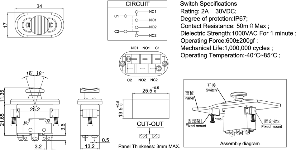 True ON-ON-ON triple-throw switch options 真正的實現(xiàn)ON-ON-ON三檔開關(guān)功能 Switch contacts sealed to IP68S. With the optional開關(guān)防水達(dá)IP68S級別。 Tested up to 1 million cycles 開關(guān)壽命達(dá)100萬次 Maintained or momentary action, single or double pole Logic level only 開關(guān)可以做到單極與雙極邏輯控制 Standard and large rocker style sizes 開關(guān)柄可以定制 Mining vehicle 應(yīng)用于礦用車輛 Large agricultural machinery大型農(nóng)業(yè)機(jī)械 Aerial work vehicle 高空作業(yè)車輛