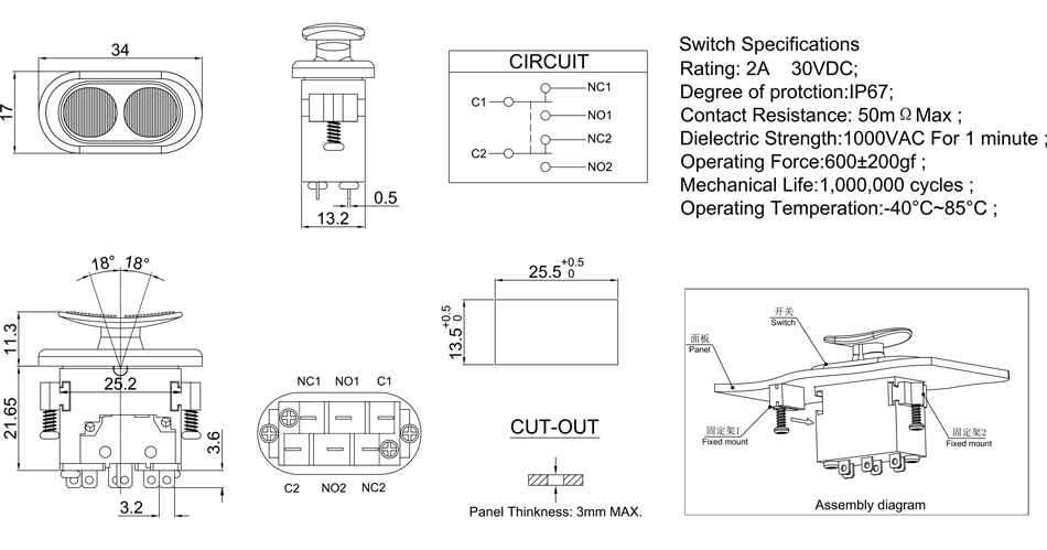 True ON-ON-ON triple-throw switch options 真正的實現ON-ON-ON三檔開關功能 Switch contacts sealed to IP68S. With the optional開關防水達IP68S級別。 Tested up to 1 million cycles 開關壽命達100萬次 Maintained or momentary action, single or double pole Logic level only 開關可以做到單極與雙極邏輯控制 Standard and large rocker style sizes 開關柄可以定制 Mining vehicle 應用于礦用車輛 Large agricultural machinery大型農業機械 Aerial work vehicle 高空作業車輛