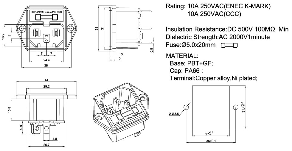 Rating: 10A 250VAC(ENEC K-MARK)